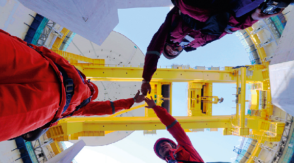 2018年3月,我國自主知識產(chǎn)權(quán)的第三代核電“華龍一號”示范工程第二臺機(jī)組進(jìn)行穹頂?shù)跹b。在穹頂起吊那一刻,參與吊裝的工程師們留下了這張合影,然后奔赴各自的工作崗位。世界核電迎來了“中國芯”時代,為茁壯成長的“華龍一號”喝彩。