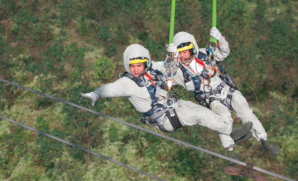 廣東省輸變電工程有限公司開展國內(nèi)首次直升機(jī)帶導(dǎo)線X光檢測作業(yè)時(shí),帶點(diǎn)作業(yè)員靠近電廠瞬間。(楊惠平 攝)
