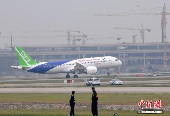 中國首款國際主流水準的干線客機C919成功首飛。(中新社記者 孫自法攝)