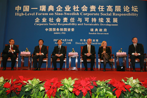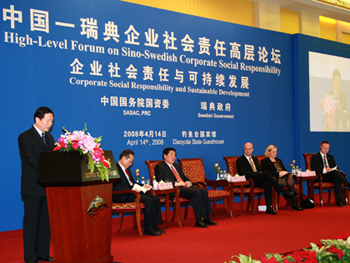 4月14日下午,國資委主任李榮融、副主任黃淑和及瑞典首相賴因費(fèi)爾特出席了由國務(wù)院國資委與瑞典政府在釣魚臺國賓館共同舉辦的中國—瑞典企業(yè)社會責(zé)任高層論壇。李榮融發(fā)表了重要講話,黃淑和主持了論壇上半場的活動。