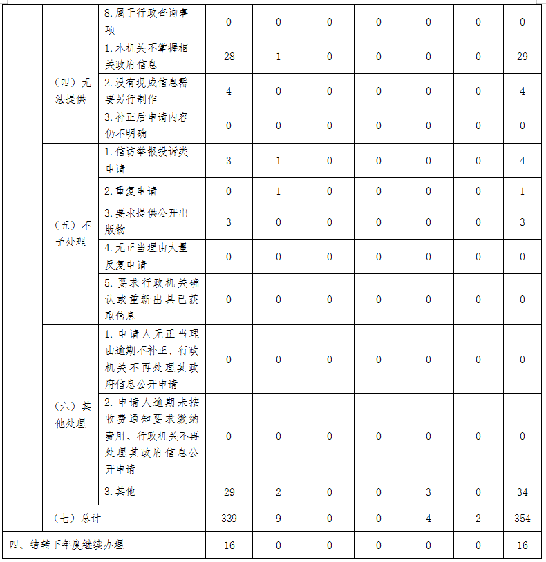 (二)依申請公開情況。全年共收到信息公開申請359件,上年度結轉(zhuǎn)辦理11件,已按規(guī)定辦結354件,結轉(zhuǎn)下年度辦理16件。已辦結的申請中,予以公開138件、部分公開8件、不予公開133件、無法提供33件、不予處理8件、其他處理34件;因信息公開被申請行政復議0件、提起行政訴訟1件。提起的行政訴訟,為未經(jīng)復議直接起訴件,其中結果維持1件,尚未審結0件。