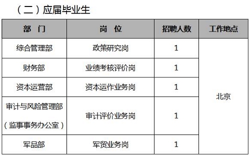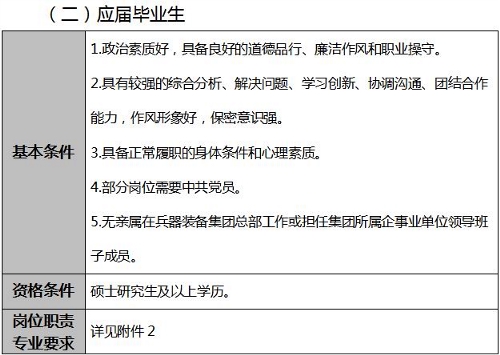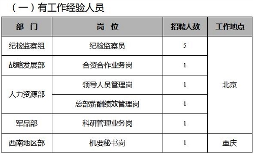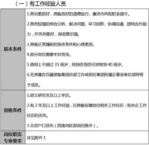 中國兵器裝備集團有限公司總部計劃招聘10名有工作經驗業務崗人員和5名應屆高校畢業生。有工作經驗人員入職后,直接上崗工作;應屆高校畢業生先派到集團公司下屬單位(北京以外地區)培養鍛煉1年,跟班勞動、跟隨管理、了解基層、了解企業、豐富經歷,提升綜合業務管理能力,培養期滿經考核合格后返回總部相關業務崗工作。現將有關招聘信息公告如下: