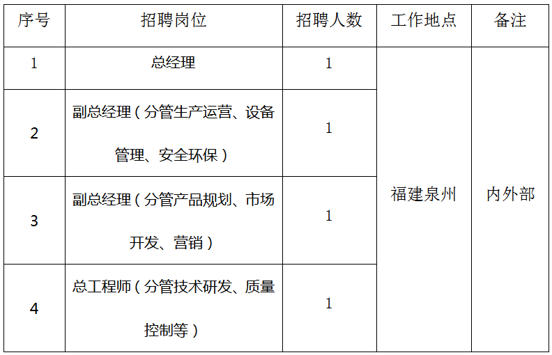 為深入貫徹落實(shí)黨中央全面深化國企改革重大決策部署和集團(tuán)公司深化生產(chǎn)經(jīng)營管理組織模式改革要求,切實(shí)推進(jìn)公司科改示范行動(dòng)向縱深發(fā)展,根據(jù)業(yè)務(wù)發(fā)展需要,現(xiàn)對(duì)中化學(xué)天辰(泉州)新材料有限公司開展市場(chǎng)化選聘職業(yè)經(jīng)理人,具體情況如下: