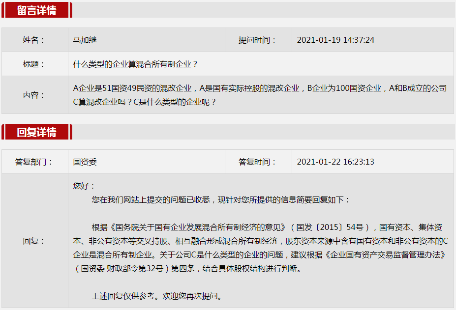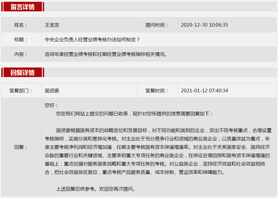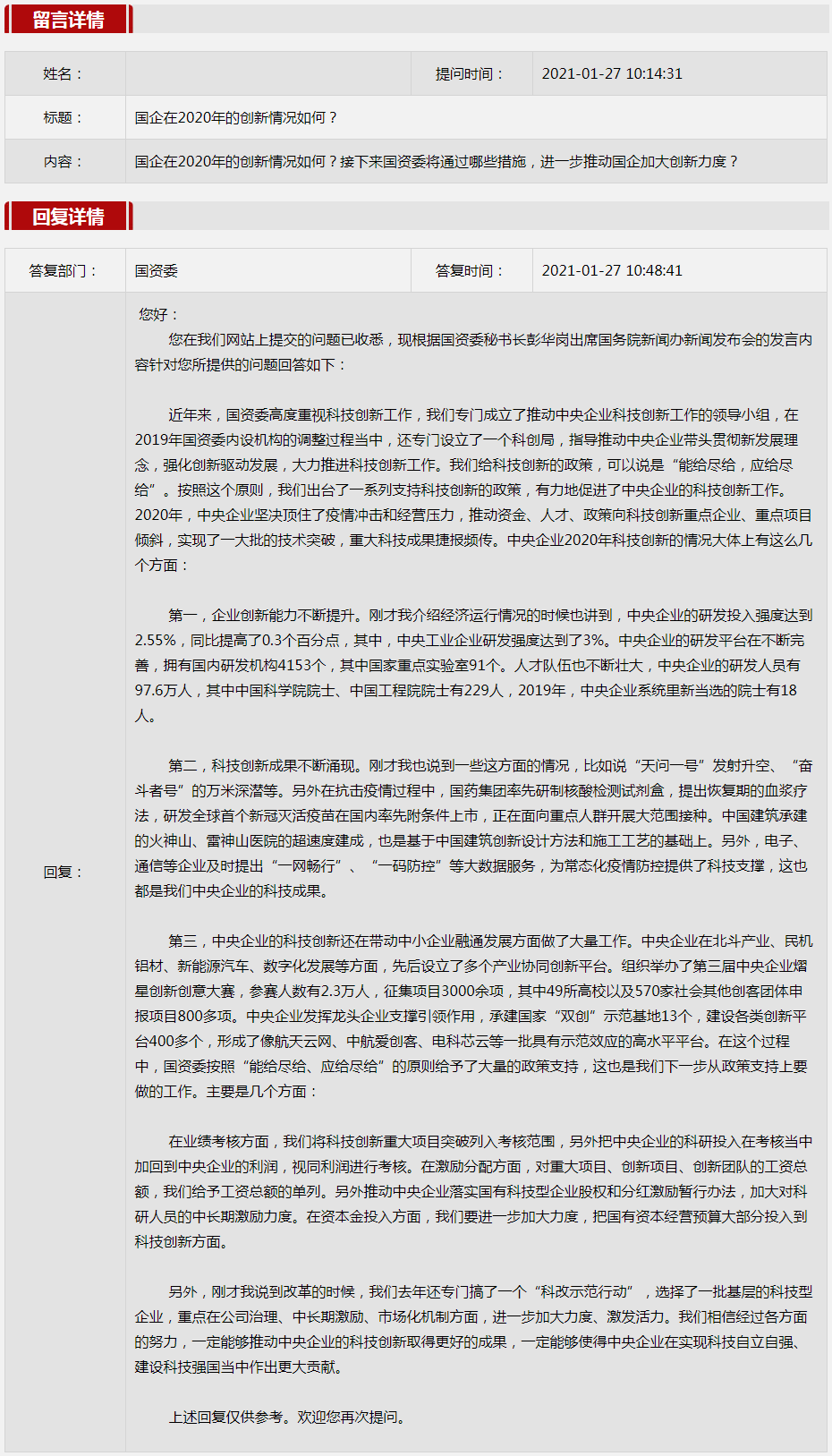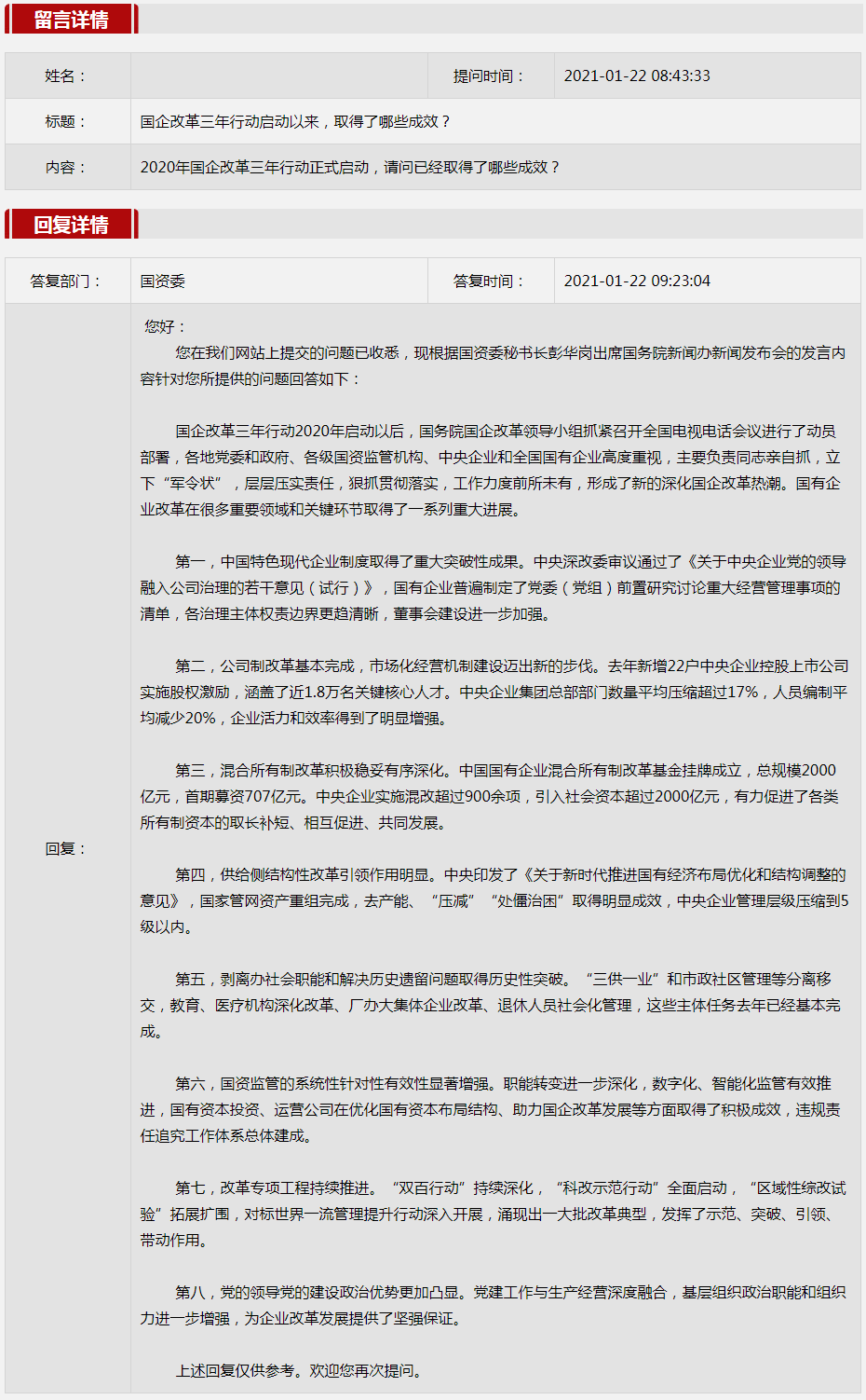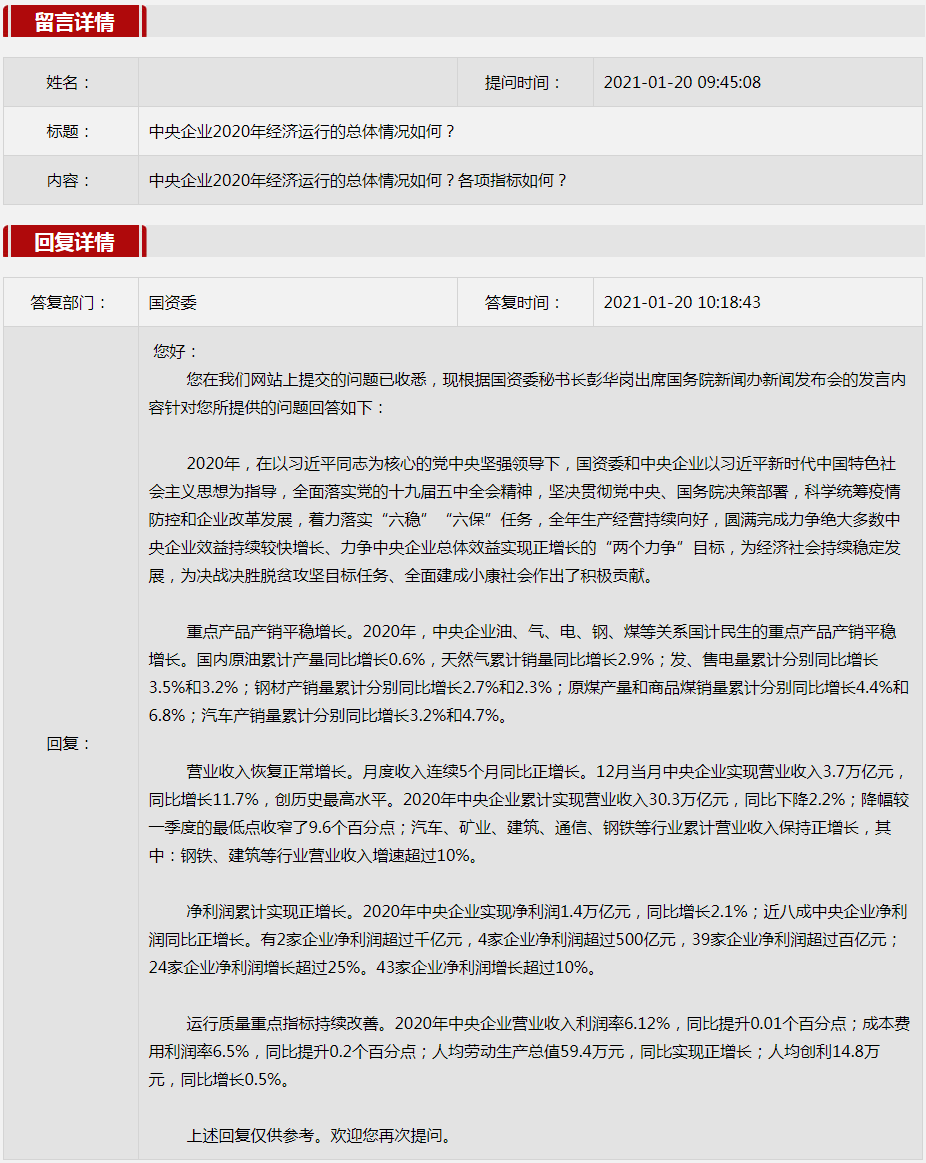 2021年1月國資委網站政務咨詢欄目部分網友提出的咨詢,我們初步做出了認真的回應,現選擇五條關注度高、點擊量高的問題,再次推薦分享。