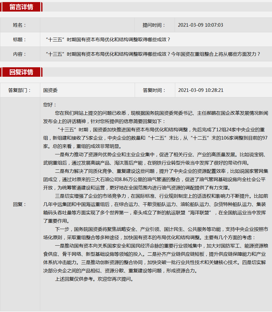 2021年3月國資委網(wǎng)站政務(wù)咨詢欄目部分網(wǎng)友提出的咨詢,我們初步做出了認(rèn)真的回應(yīng),現(xiàn)選擇五條關(guān)注度高、點(diǎn)擊量高的問題,再次推薦分享。