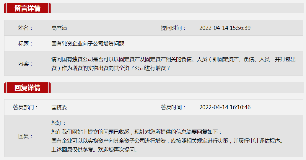 3.關于國有獨資企業(yè)向子公司增資的問題。
