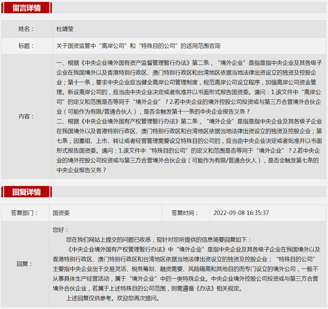 4.關于國資監管中“離岸公司”和“特殊目的公司”的適用范圍咨詢。
