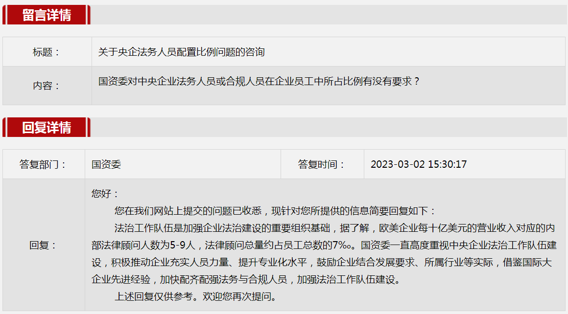 2.關于央企法務人員配置比例問題的咨詢。