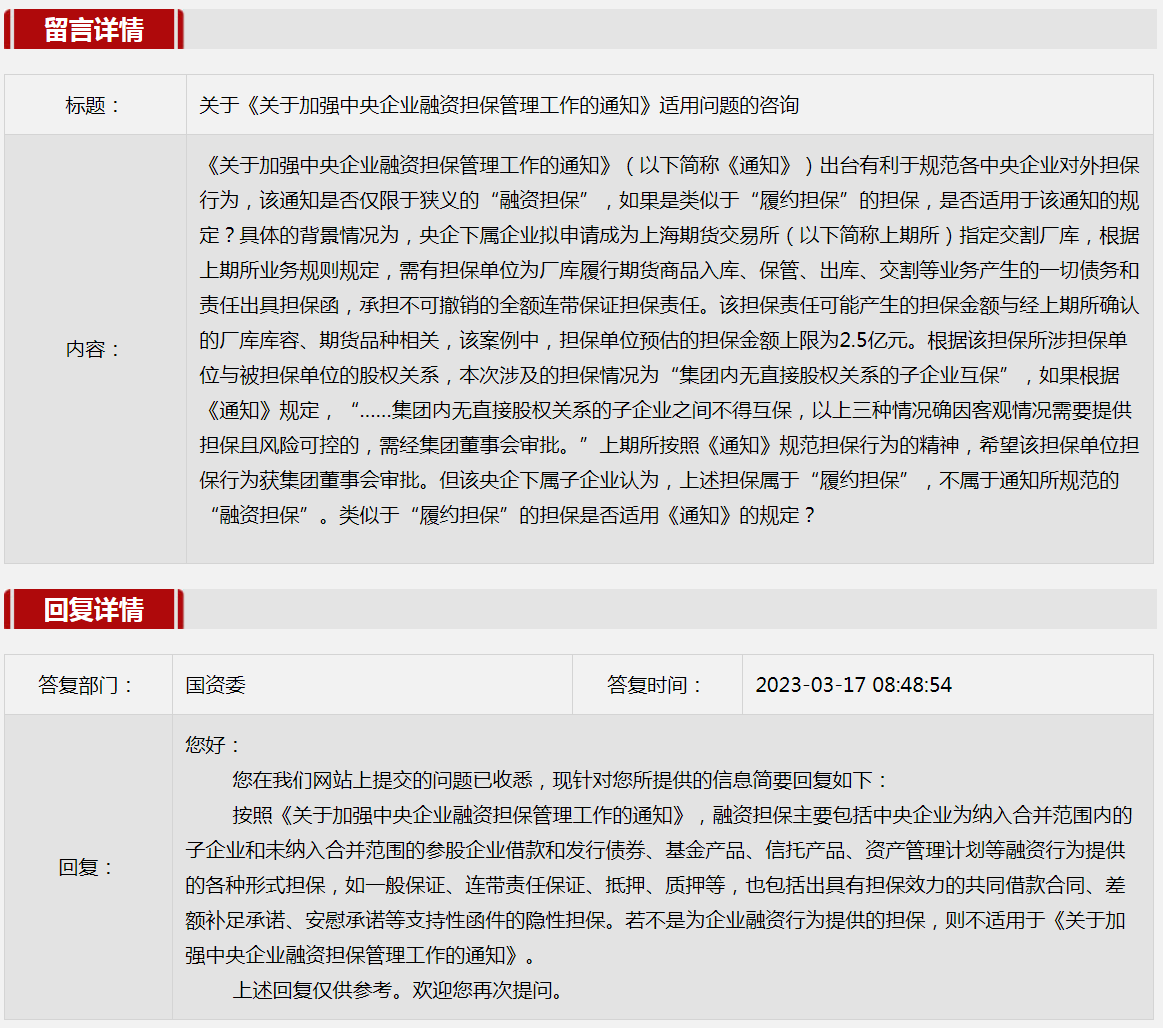 4.關于《關于加強中央企業融資擔保管理工作的通知》適用問題的咨詢。
