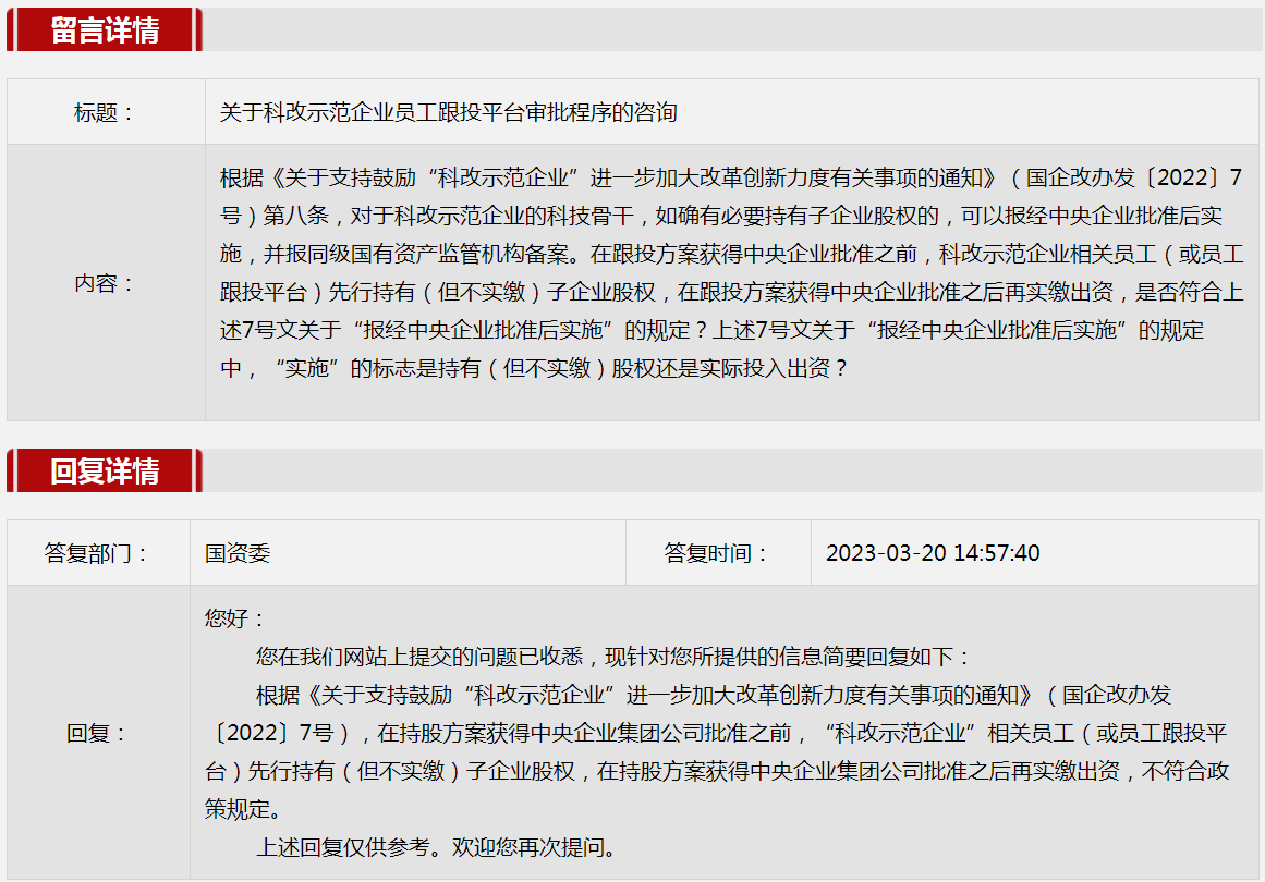 5.關于科改示范企業員工跟投平臺審批程序的咨詢。