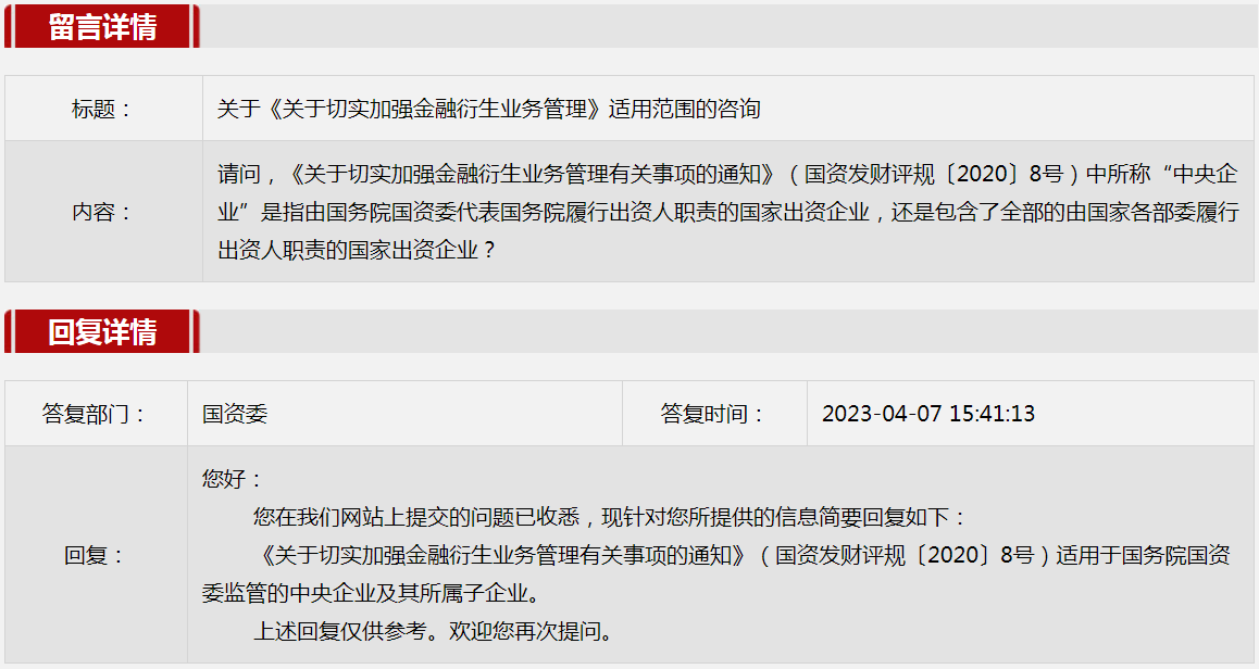 3.關(guān)于《關(guān)于切實加強(qiáng)金融衍生業(yè)務(wù)管理》適用范圍的咨詢。