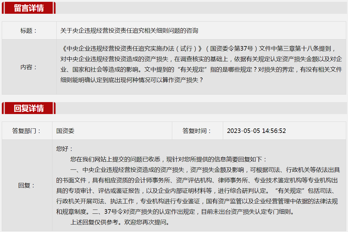 1.關于央企違規經營投資責任追究相關細則問題的咨詢。