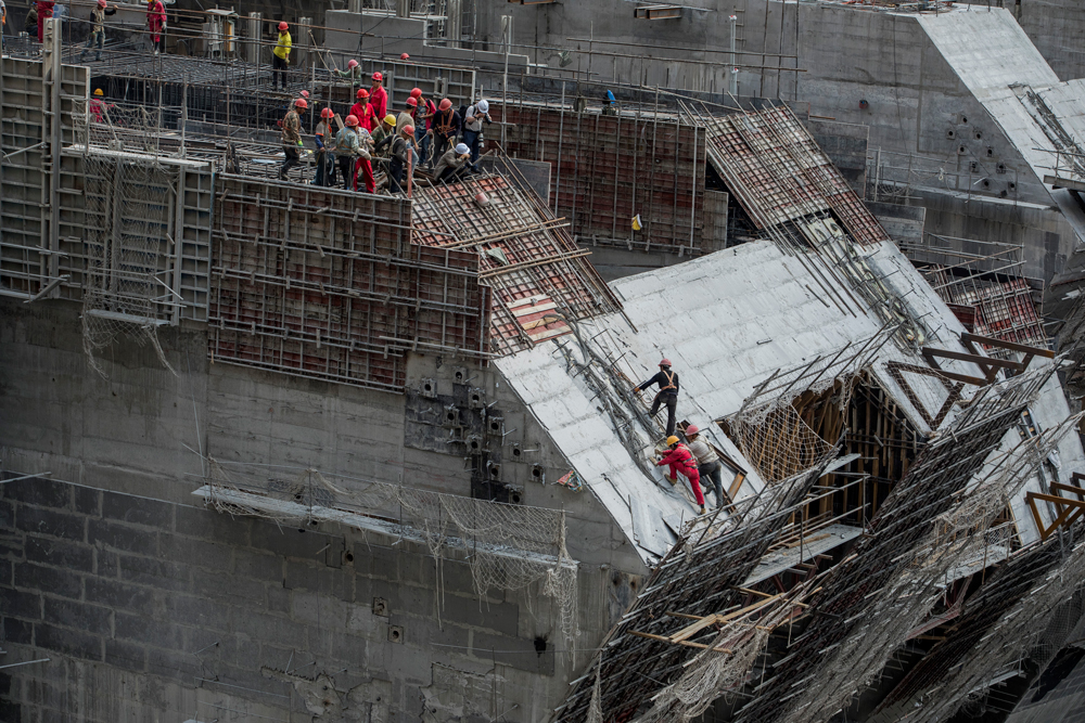 攝影師們拍攝工人在烏東德水電站大壩主體上的作業(yè)場景 攝影/王攀