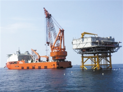 圖為海上升壓站模塊吊裝現場。 (記 者 瞿 劍攝)