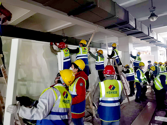 由于建設工期緊,醫院各項施工重疊作業,交叉影響非常大。在現場,小分隊一方面由技術人員與建設方和廠方貼近對接,了解現場建筑物結構和工作要求,另一方面見縫插針,合理安排工序、場地和人員,力求快速推進施工。