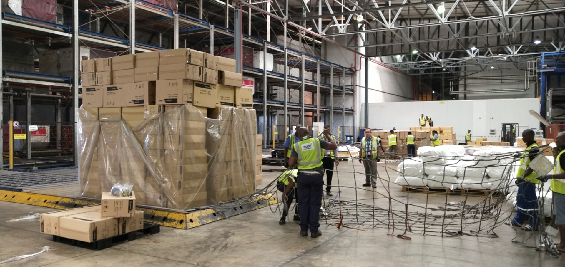 通過國網(wǎng)電商公司電商交易平臺采購的防疫物資正從南非德班市打包運往廣東。央企電商聯(lián)盟/供圖