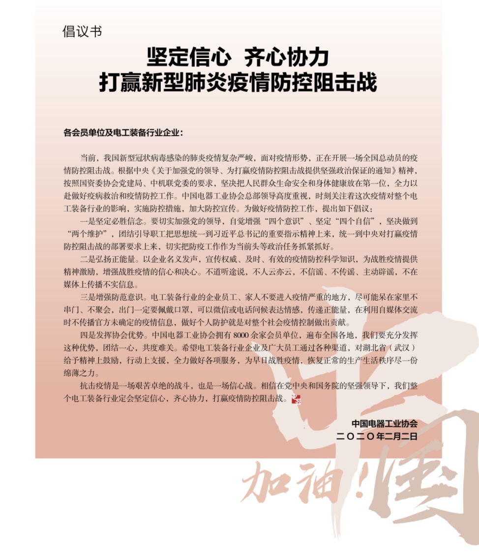 2月2日,中電協(xié)向全行業(yè)發(fā)出《堅(jiān)定信心 齊心協(xié)力 打贏新型肺炎疫情防控阻擊戰(zhàn)》倡議書。同日,中電協(xié)向湖北省(武漢)電工裝備行業(yè)企業(yè)發(fā)出慰問,中電協(xié)表示:“請你們堅(jiān)信,有黨中央、國務(wù)院和各級(jí)政府的正確領(lǐng)導(dǎo),有中電協(xié)8000余家會(huì)員單位作為堅(jiān)強(qiáng)的后盾,一定能夠戰(zhàn)勝困難,取得防控新型冠狀病毒肺炎的最終勝利!”