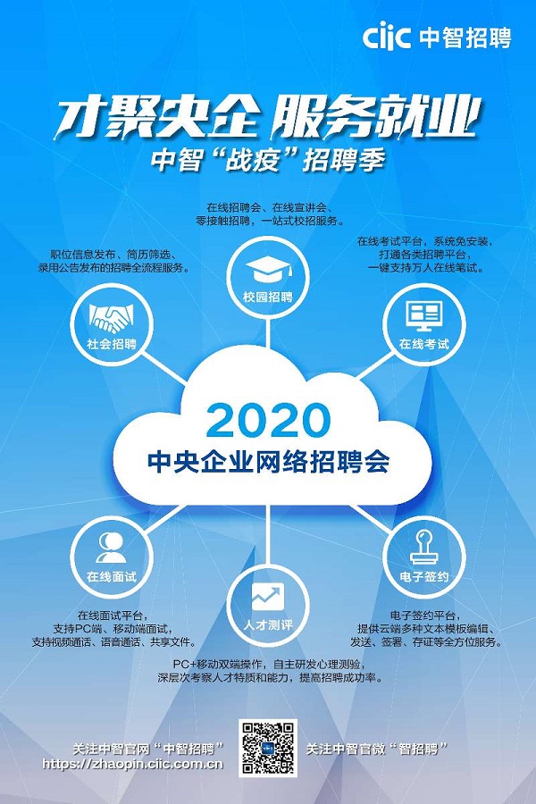 中智作為一家主營人力資源及智力服務的中央企業,為做好疫情防控下的人才招聘工作,服務穩就業、穩預期的工作大局,主動作為、充分發揮行業優勢、積極履行央企社會責任,依托自身在招聘服務方面的獨特優勢,全力跟進落實國資委提出的“保障企業用人需求、促進生產恢復、保障和改善民生、穩定就業”的有關要求,聯合全國各地知名高校和國務院國資委所屬各中央企業,舉辦“才聚央企,服務就業,中智戰疫招聘季”專項招聘活動。活動致力于為各中央企業提供“定制化、顆粒化、一體化”的全流程線上招聘服務,實現“信息發布—簡歷收集—簡歷篩選—在線筆試、在線面試、在線測評—錄用公告發布—電子簽約”的全流程線上招聘服務。線上招聘服務集成“社會招聘、校園招聘、在線考試、在線面試、人才測評、電子簽約”等模塊功能的一體化布局,使企業、求職者足不出戶即可滿足雙方的用工、求職需求。