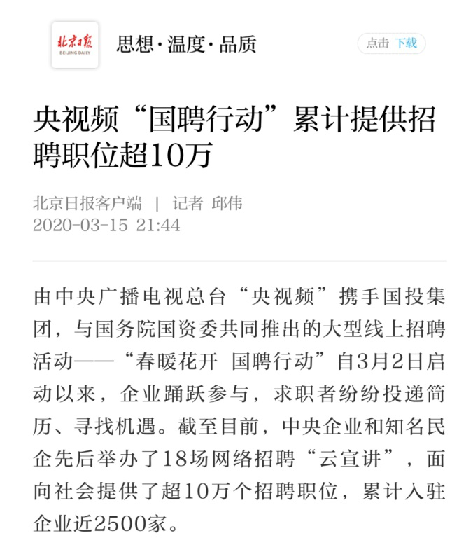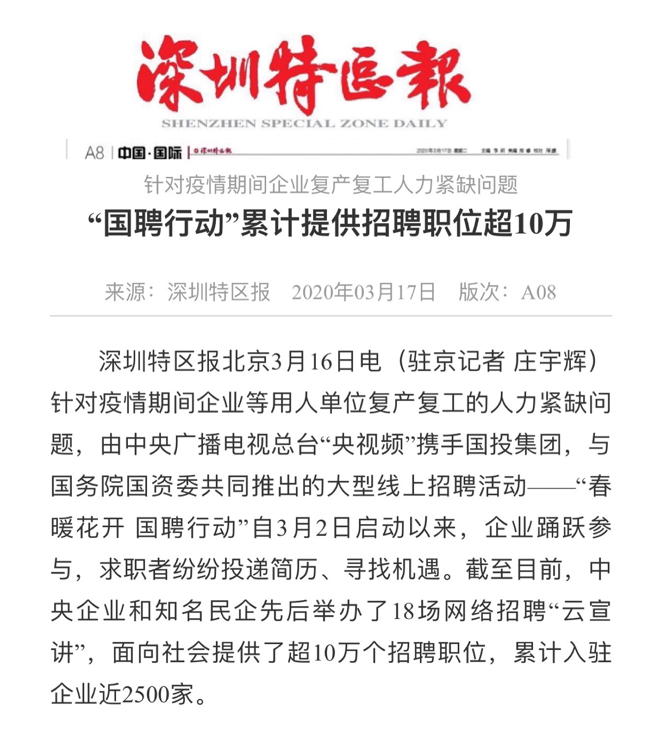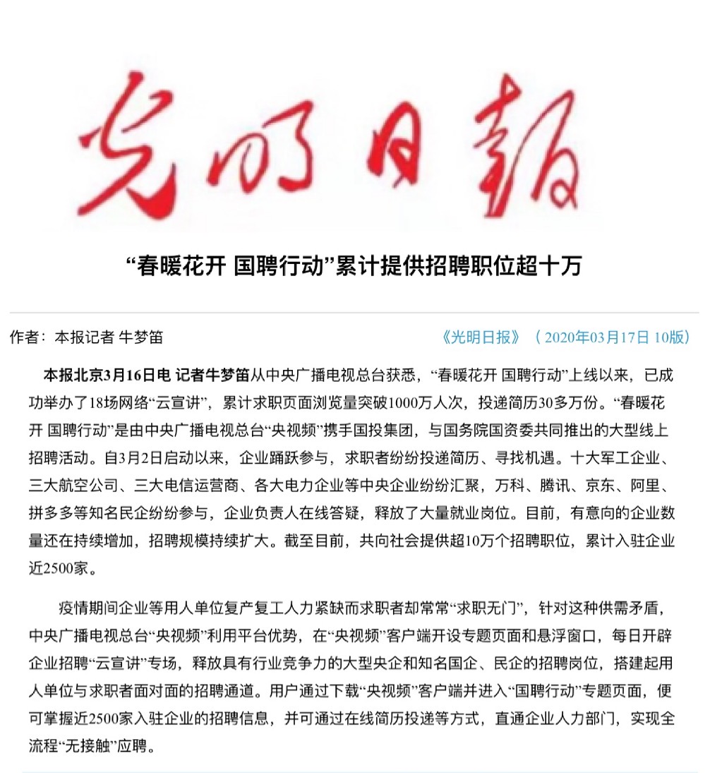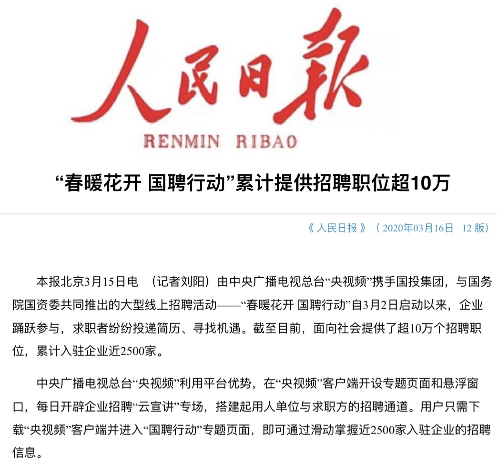由中央廣播電視總臺“央視頻”攜手國投集團,與國務院國資委共同推出的大型線上招聘活動——“春暖花開 國聘行動”,自3月2日啟動以來,企業踴躍參與,求職者紛紛投遞簡歷。截至3月14日已面向社會提供了超10萬個招聘職位,累計入駐企業近2500家,引發眾多媒體和網站轉載報道。