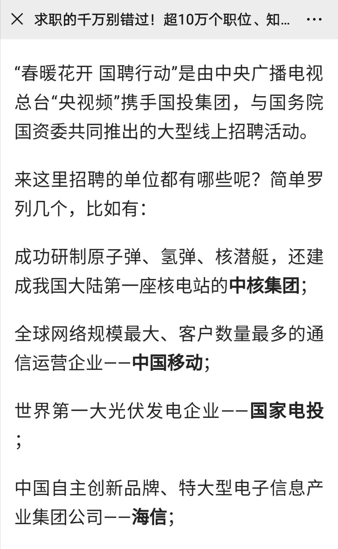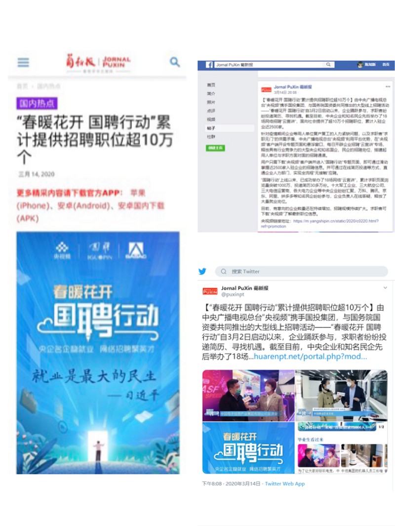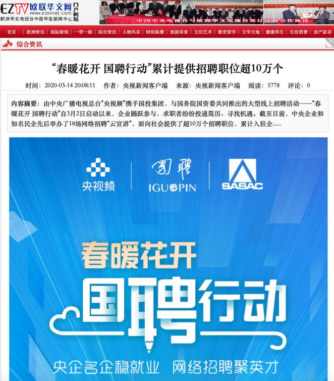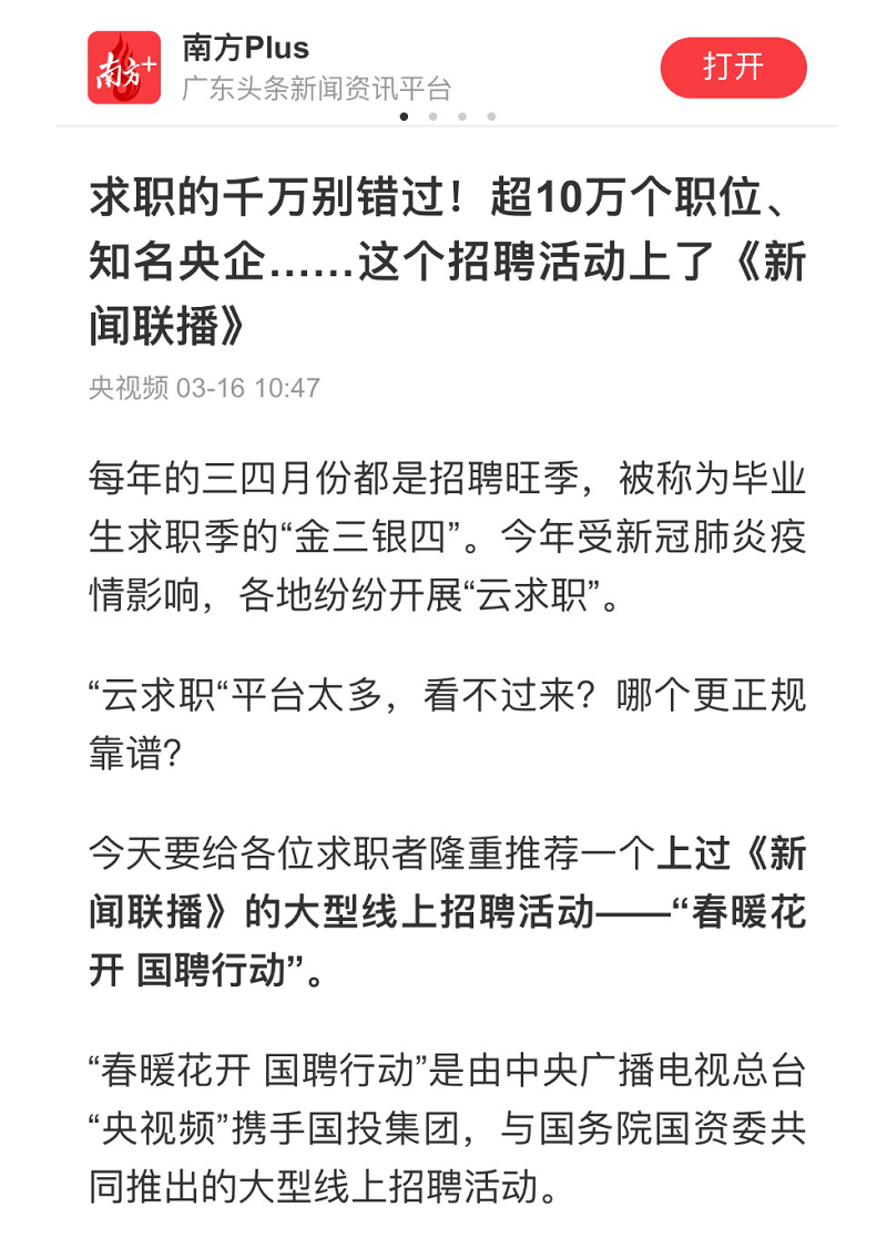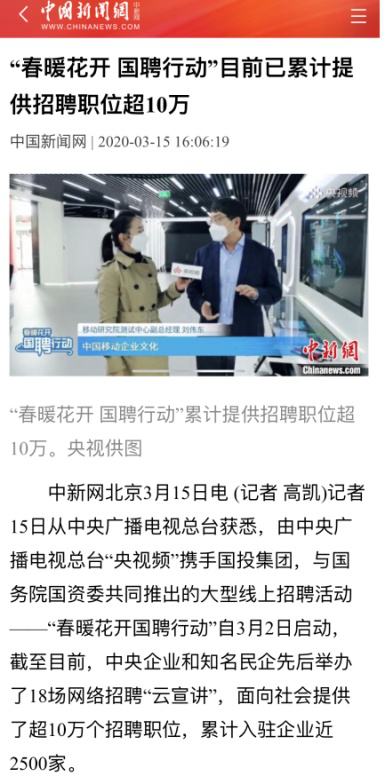 由中央廣播電視總臺“央視頻”攜手國投集團,與國務院國資委共同推出的大型線上招聘活動——“春暖花開 國聘行動”,自3月2日啟動以來,企業踴躍參與,求職者紛紛投遞簡歷。截至3月14日已面向社會提供了超10萬個招聘職位,累計入駐企業近2500家,引發眾多媒體和網站轉載報道。