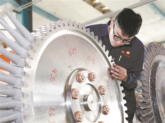 張成正在組裝煙氣輪機葉片。