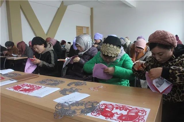 尤其對于普通家庭的回民女孩子來說,十幾歲就嫁人是常態。結婚之后,青壯男子為了養家糊口都是遠走他鄉,建筑工地、礦場、工廠,哪里能找到活干就往哪里去。條件好一些的,會買一輛車,跑跑運輸。老人、女人和孩子自然就成為留守人口。經過認真探討,華潤項目團隊將剪紙回繡確定為海原華潤希望小鎮產業幫扶的重點方向之一,這個“離土”的文化產業項目與小鎮的各方面需求都十分契合。