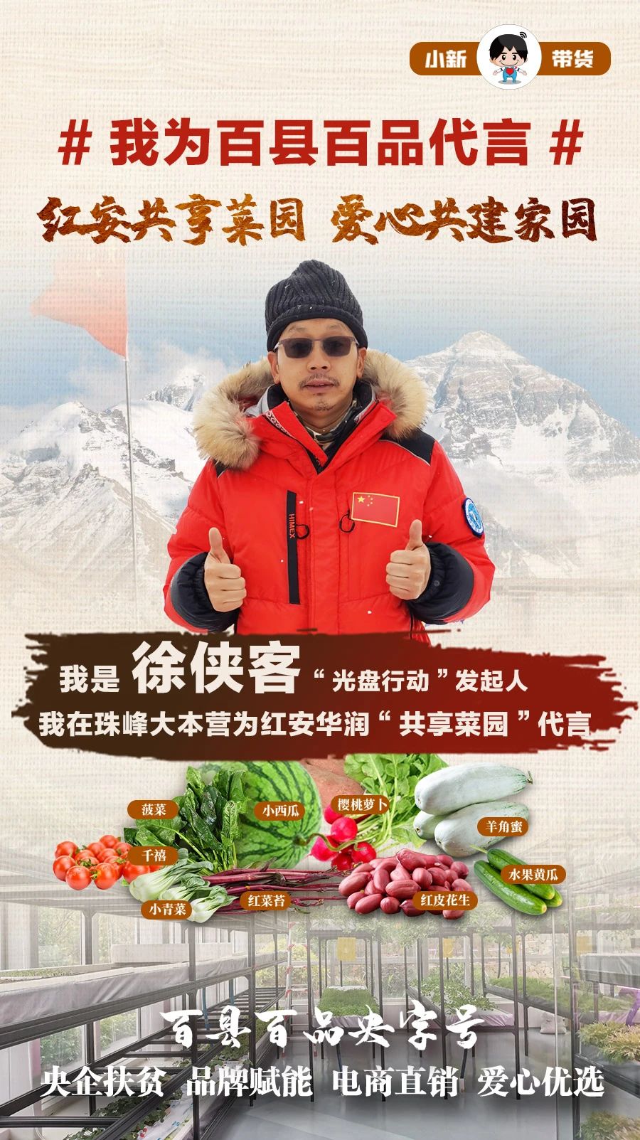 5月23日下午3點,湖北紅安華潤希望小鎮,紅安共享菜園,愛心共建家園。屆時,“光盤行動”發起人,“共享菜園”網絡代言人徐俠客,將從遙遠的珠穆朗瑪峰與我們連線,為我們現場呈現珠峰大本營的景象。