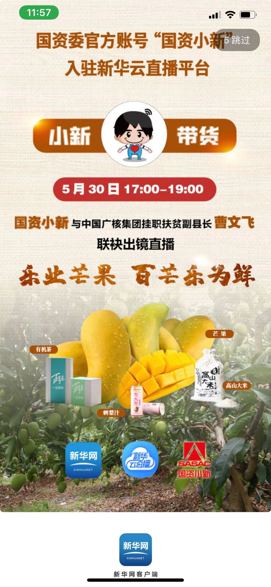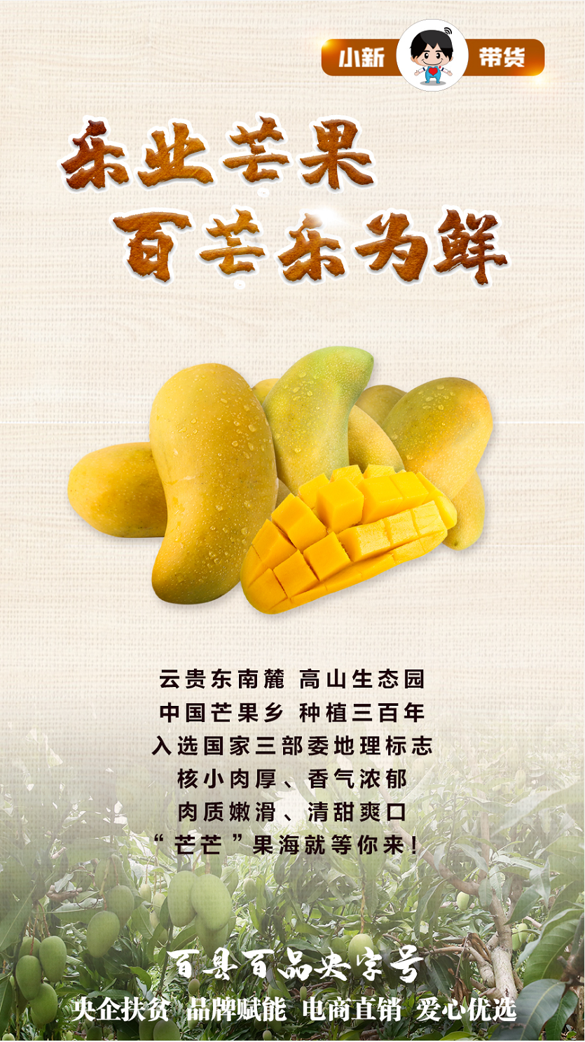 5月30日,“百縣百品央字號”暨“小新帶貨”融媒體扶貧行動第三場直播帶貨——廣西百色芒果專場,在“國資小新”快手直播間火熱開播。“國資小新”與中國廣核集團扶貧副縣長曹文飛聯袂出鏡直播,重點推介新鮮上市的百色小臺農品種芒果。
