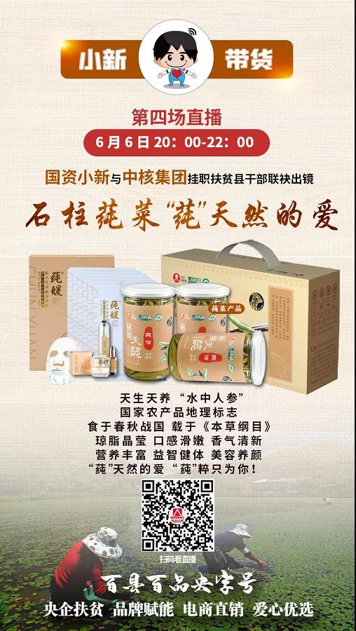 6月6日晚8點-10點,百縣百品央字號暨小新帶貨第四場走進中核集團定點扶貧縣——重慶石柱,在全球最大的莼菜生產基地,為您直播帶貨“水中人參”——石柱莼菜。