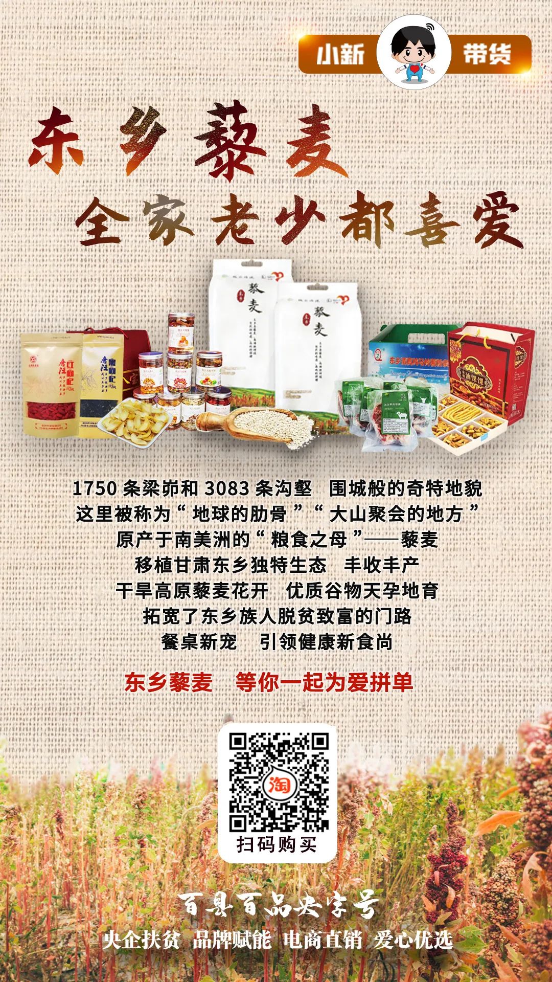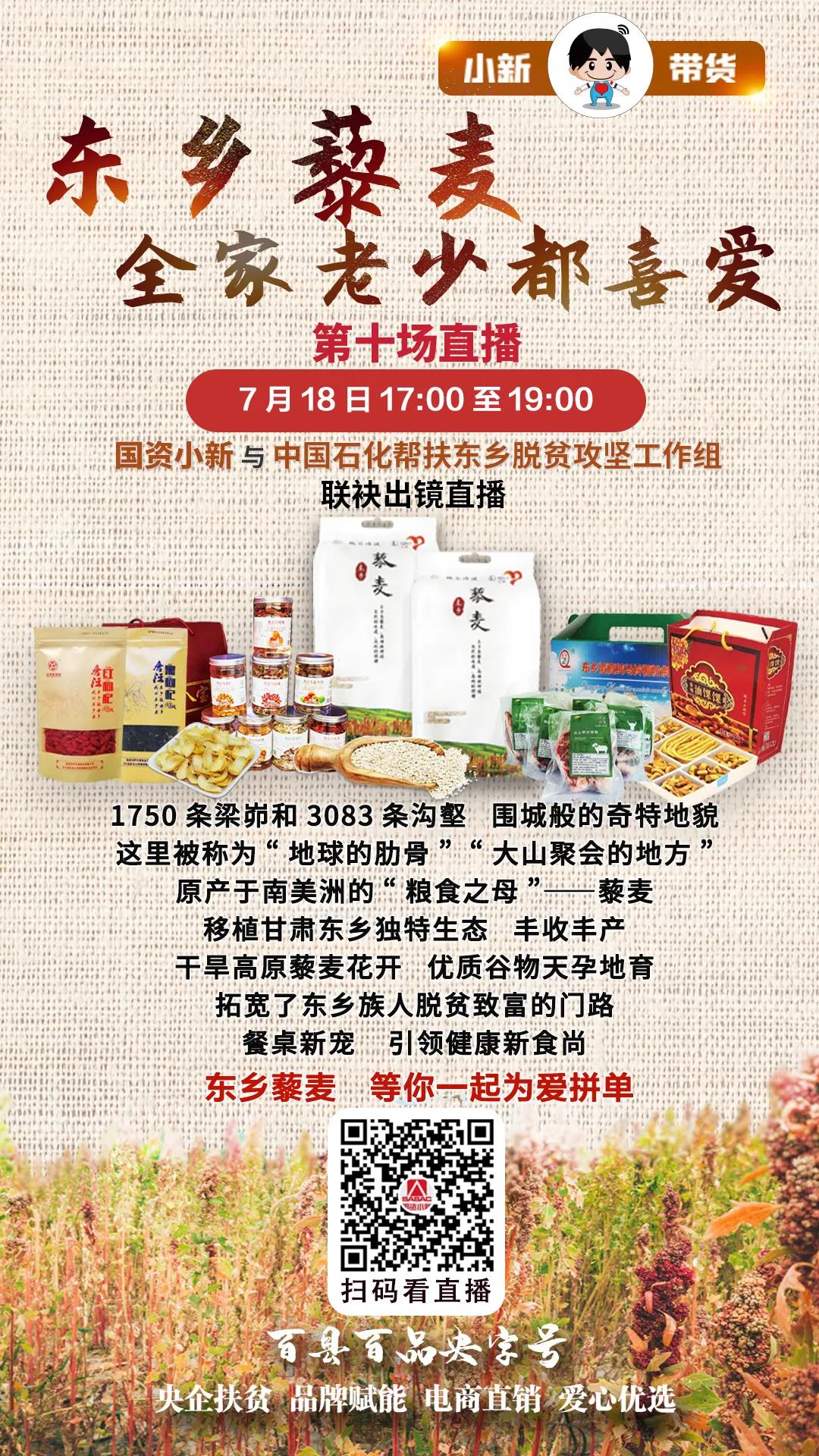 7月18日17:00—19:00,#百縣百品央字號#暨#小新帶貨#第十場走進(jìn)中國石化定點(diǎn)扶貧縣——甘肅省臨夏回族自治州東鄉(xiāng)族自治縣,為您直播帶貨來自黃土高原的綠色健康“超級谷物”——藜麥。