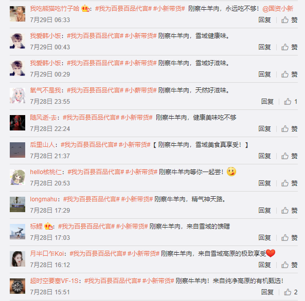 7月28日起,小新全網征集剛察牛羊肉廣告語,為剛察牛羊肉等當地農畜產品品牌賦能。廣大網友積極響應,獻智慧更獻愛心: