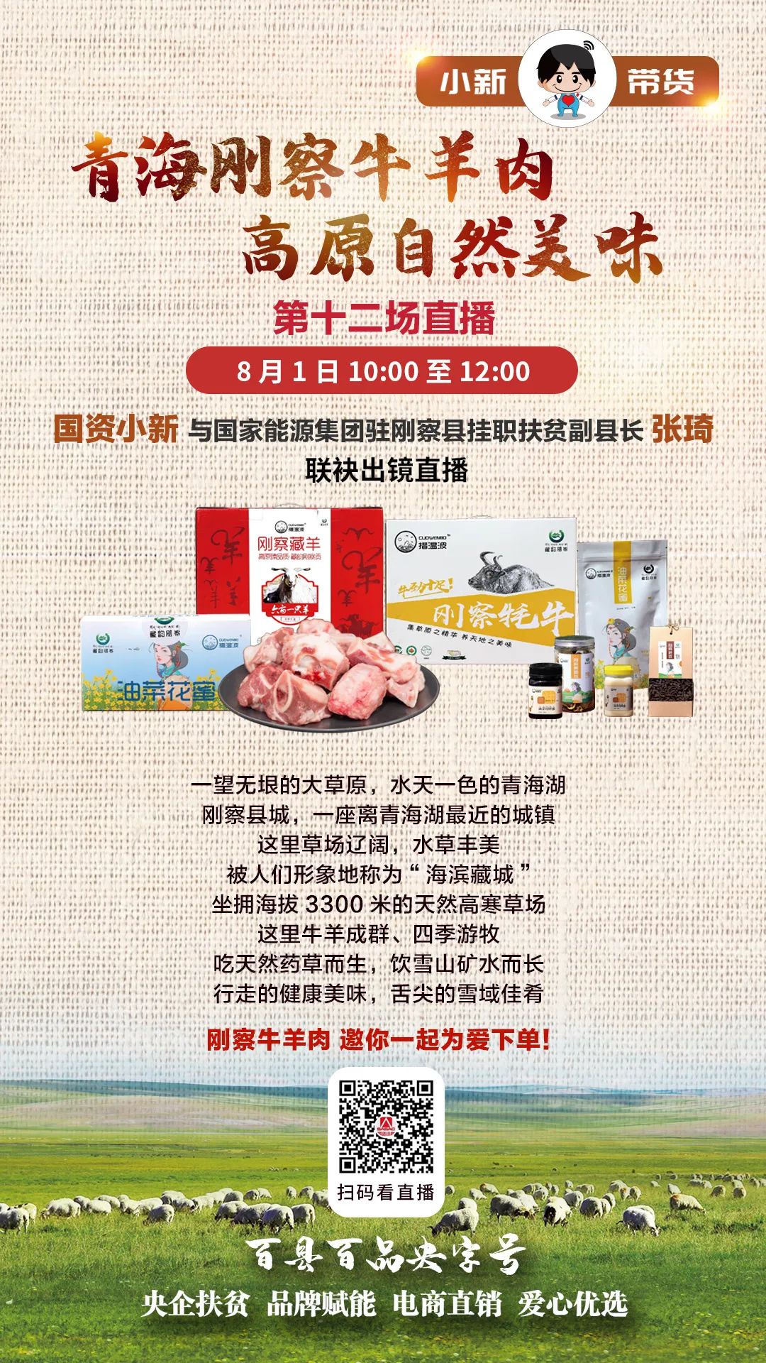 8月1日上午10:00-12:00,#百縣百品央字號#暨#小新帶貨#第十二場走進國家能源集團對口支援縣——青海省海北藏族自治州剛察縣。為您直播帶貨純天然雪域佳肴,剛察牛羊肉。
