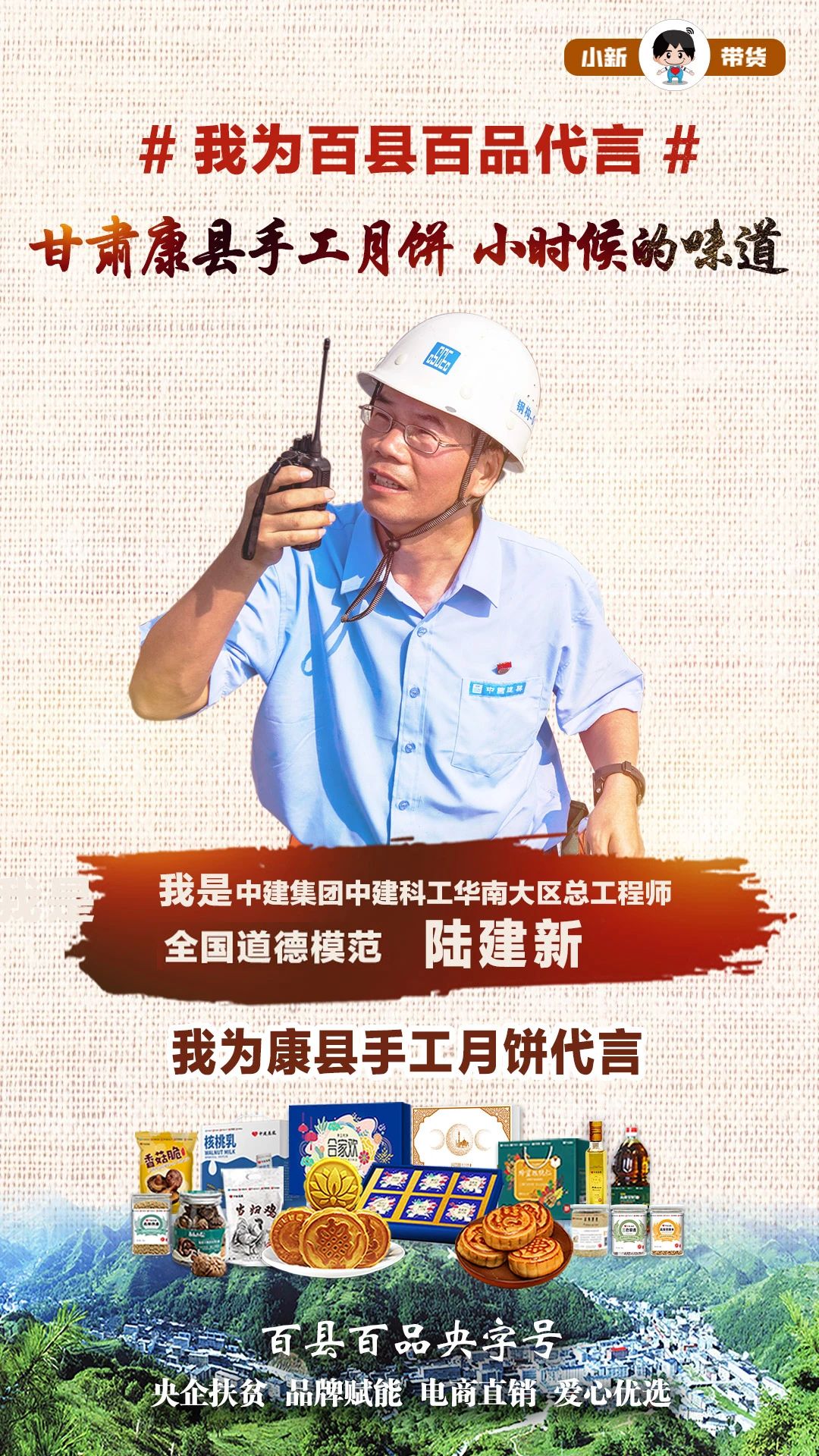 直播間,中建集團掛職康縣縣委常委、副縣長帶貨康縣手工月餅等當地特色農產品;全國道德模范、中建集團中建科工華南大區總工程師陸建新,作為網絡公益代言人,通過視頻連線助陣,扶貧助農、為愛發聲。