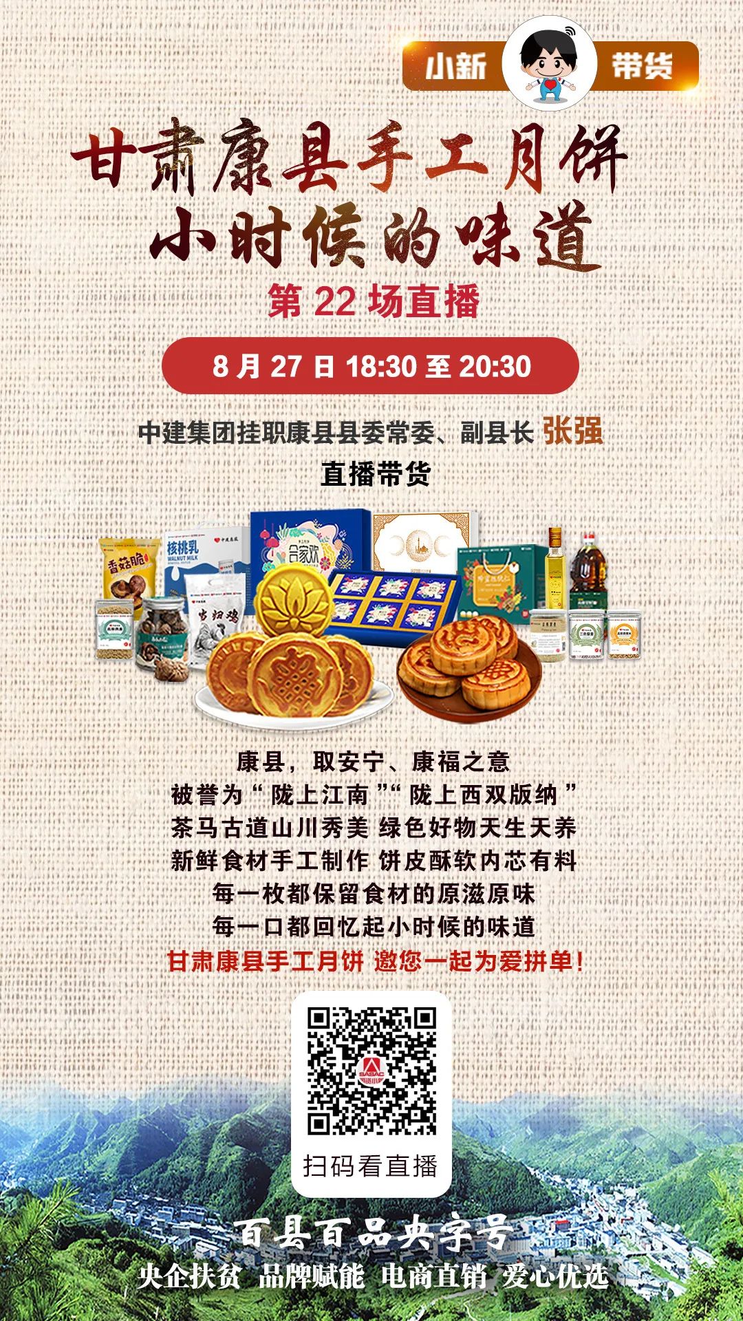 8月27日18:30至20:30,“百縣百品央字號”暨“小新帶貨”走進“隴上江南”康縣,在直播間里,手工月餅等十余款特產好物等你采購。