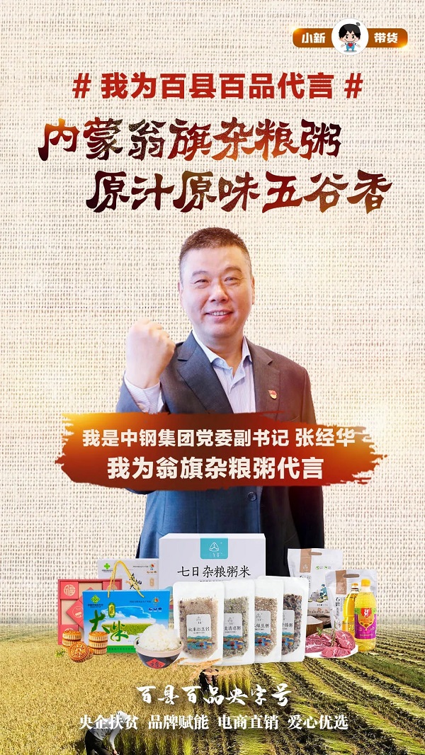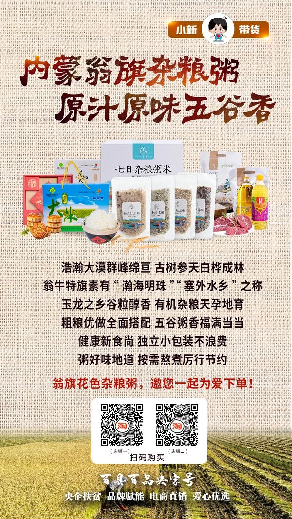 9月5日17:00—19:00,#百縣百品央字號#暨#小新帶貨#第二十三場走進中鋼集團定點幫扶縣——內蒙古自治區赤峰市翁牛特旗,帶貨五谷雜糧粥等當地特色農產品。