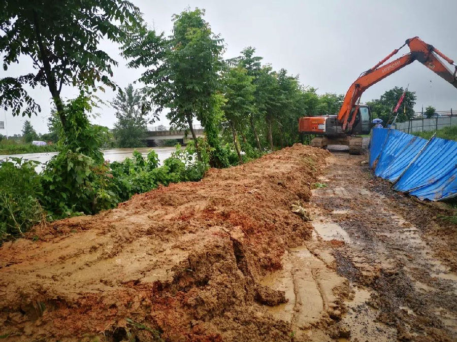 7月6日,臨近中交四公局鄂州三江港項(xiàng)目的螺螄港水位急劇上漲,最低處河水水位距離堤頂不足10厘米,隨時(shí)可能發(fā)生漫堤險(xiǎn)情。接到通報(bào)后,鄂州三江港項(xiàng)目立即啟動(dòng)抗洪搶險(xiǎn)應(yīng)急預(yù)案,組織項(xiàng)目全體人員開(kāi)展應(yīng)急搶險(xiǎn)工作,調(diào)動(dòng)挖掘機(jī)填高河堤并裝碼沙袋加固,經(jīng)過(guò)不間斷的人機(jī)配合,壘起了一條高60厘米,長(zhǎng)80米的河堤,保障了項(xiàng)目及周邊兩個(gè)村莊村民的生命財(cái)產(chǎn)安全。
