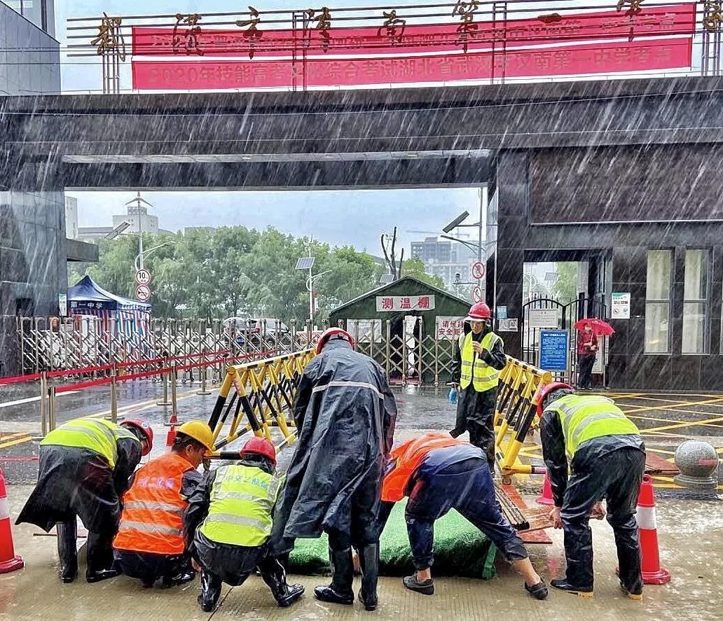 7月7日高考第一天,中交二航局馬影河項(xiàng)目在接到武漢市漢南區(qū)水務(wù)和湖泊局通知后,按防汛應(yīng)急救援工作部署,立即組建防汛應(yīng)急救援搶險(xiǎn)隊(duì),火速趕往漢南一中校門(mén)口,在積水處搭建了一座簡(jiǎn)易的小型“浮橋”,保證考生順利進(jìn)入考場(chǎng)。同時(shí),項(xiàng)目部調(diào)集五臺(tái)抽水泵,排除校園洼地積水。