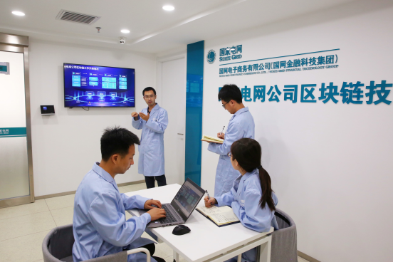 國(guó)網(wǎng)區(qū)塊鏈技術(shù)實(shí)驗(yàn)室工作人員在討論區(qū)塊鏈技術(shù)攻關(guān)相關(guān)問(wèn)題