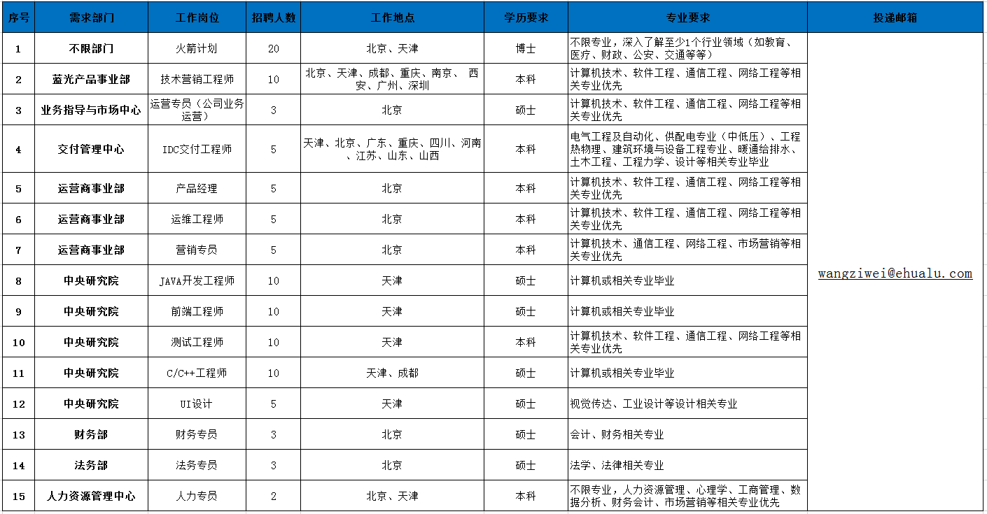 本次招聘以電子郵件方式接收簡(jiǎn)歷,應(yīng)聘者請(qǐng)將個(gè)人簡(jiǎn)歷發(fā)送至各單位招聘工作郵箱。
