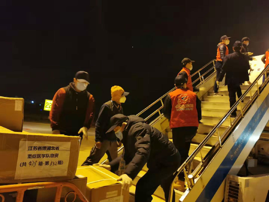 朱本林在機坪志愿參與防疫物資搬運——左起第三人為朱本林
