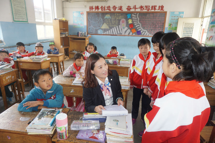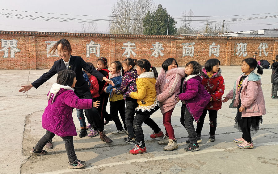 中檢集團(tuán)志愿者在“金秋支教”扶貧活動(dòng)中與魯山縣董周九小的學(xué)生們互動(dòng)游戲。