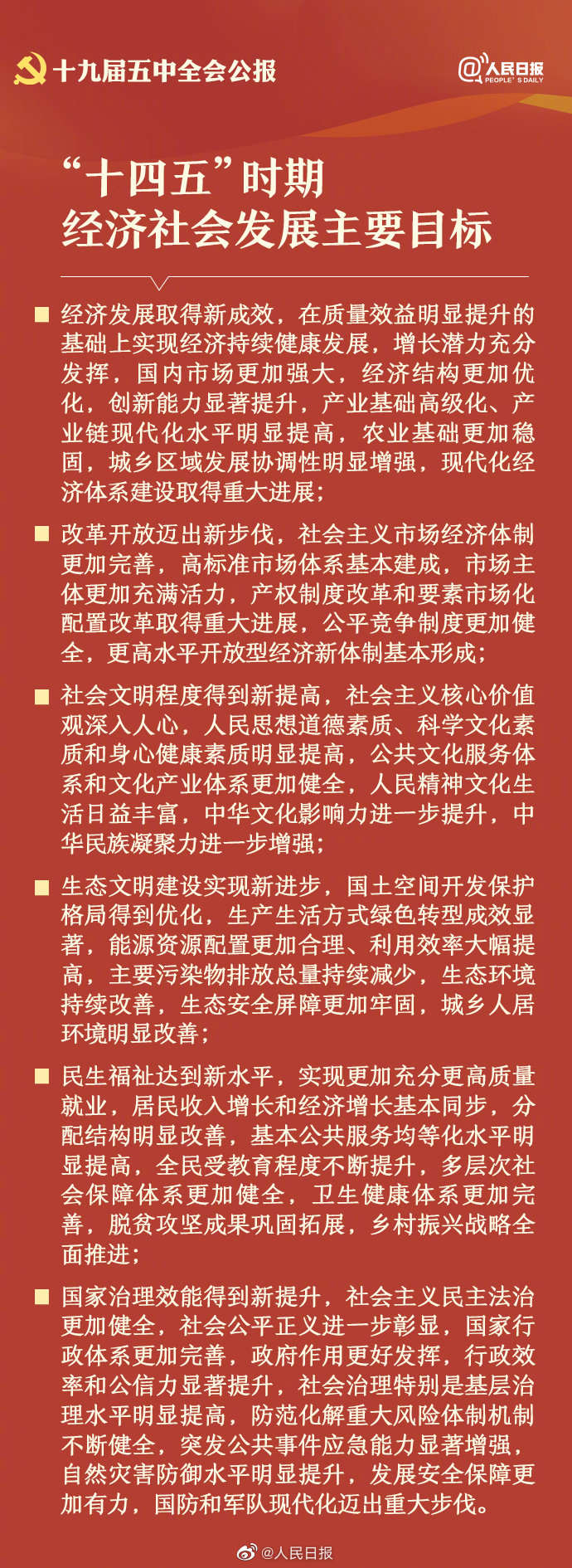 黨的十九屆五中全會公報:十四五時期經濟社會發展主要目標