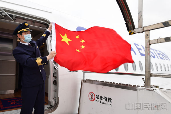 東航機組揮舞國旗,迎接我國首批援外抗疫專家組從浦東機場登機啟程前往意大利
