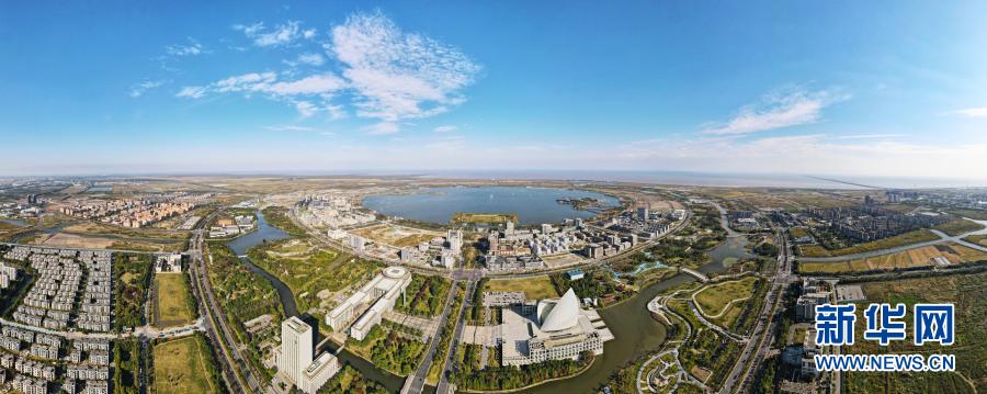 上海浦東新區臨港新城滴水湖畔(10月25日攝,無人機全景照片)。新華社記者 方喆 攝