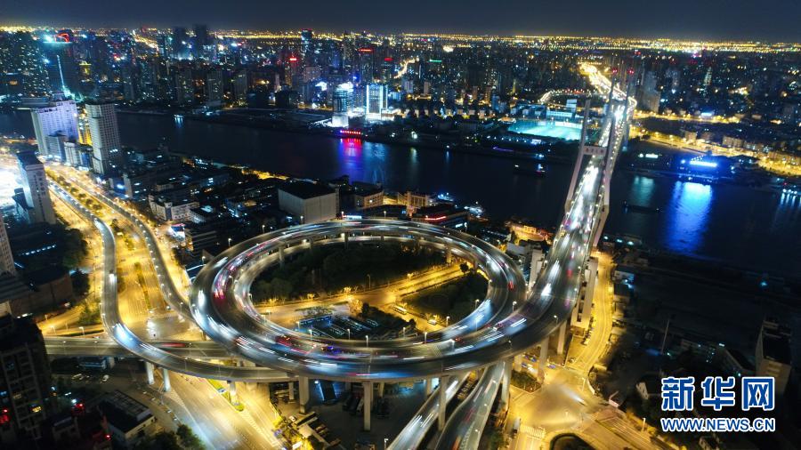 上海南浦大橋夜景(2017年4月13日攝,無人機照片)。新華社記者 丁汀 攝