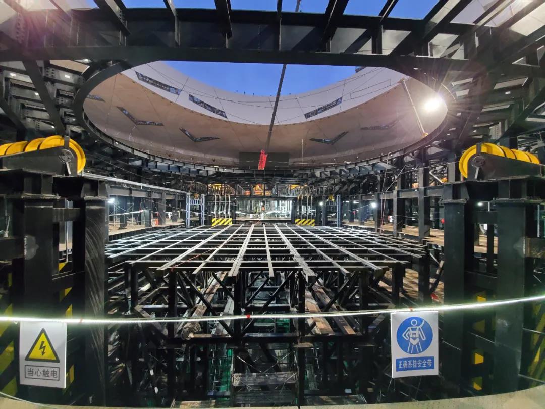 當高高矗立的“冰瀑”緩緩打開,運動員開始入場,絢麗的光彩瞬間震撼每一位觀眾。這是一座高約60米的大型鋼結構表演裝置,用鋼量約730噸,有6000多根構件。作為最基礎的結構裝置,后期集成系統、升降系統包括LED顯示屏等系統,都需要在鋼結構裝置上去架設,因此對于組接焊縫和安裝誤差要求極為苛刻,裝配的誤差要求控制在1.5毫米之內。除精度要求極高外,工期也十分緊張, 2021年8月14日第一批設備底座進場,9月11日最后一批構件出廠,9月20日交付進行LED安裝,這些僅用時37天。