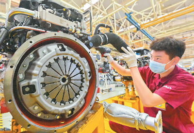 4月27日,工人在位于山東省青州市的江淮汽車山東分公司總裝車間內(nèi)組裝生產(chǎn)。