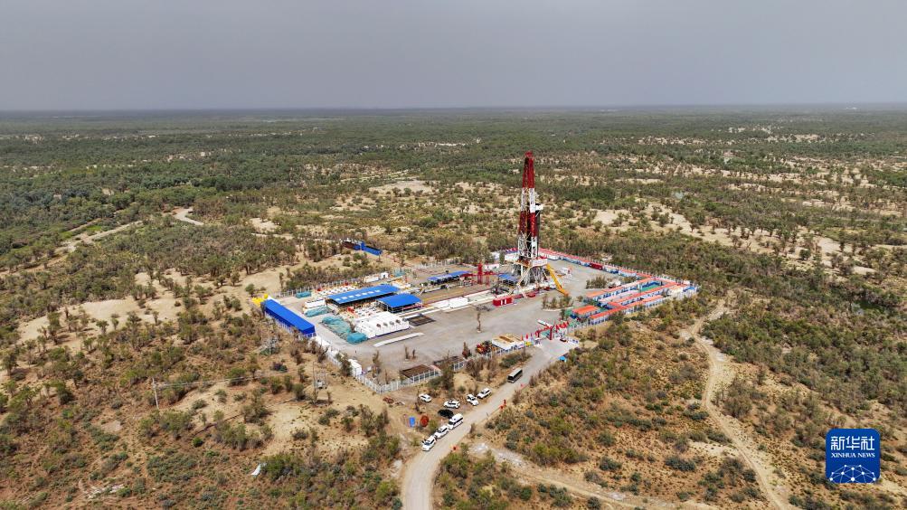8月21日拍攝的中國石化塔里木盆地“深地工程”躍進3-3XC油氣井。該井設計井深9472米,截至8月28日,鉆探深度已達8471米(無人機照片)。