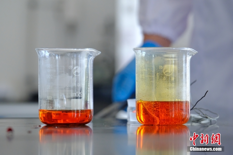 碳纖維在王水中的腐蝕試驗。碳纖維(左)在王水中沒有任何反應,鐵絲(右)有腐蝕反應。