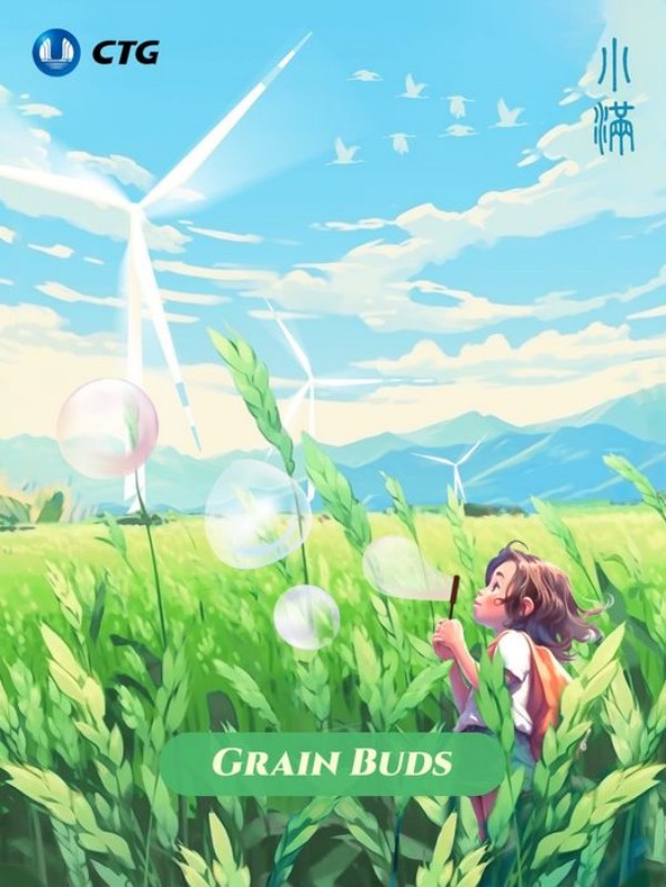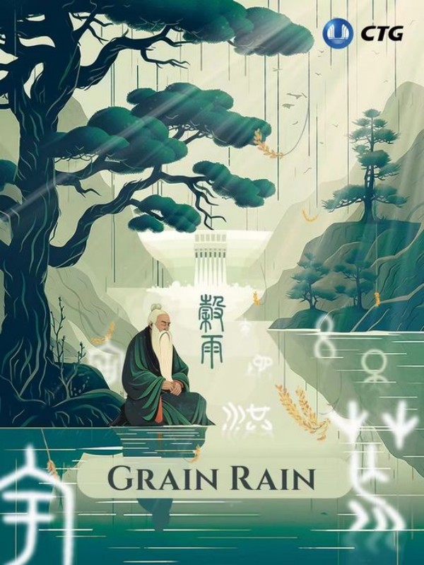 海報描繪了一個中國古代白胡子老爺爺安詳地坐在樹下,似乎在默默感受著谷雨時節的細雨潤物。遠處的大壩巍然屹立,展示著三峽集團的宏偉工程與巨大的社會貢獻。